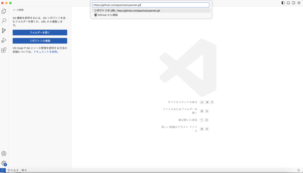 ソース管理メニューから「リポジトリの複製」を選択して、SupersetのGithubからクローンします。